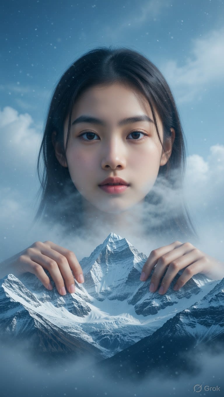 Surreal Giant Portrait Above Snow Mountains — female AI design template. Customize and generate on Aiartform.