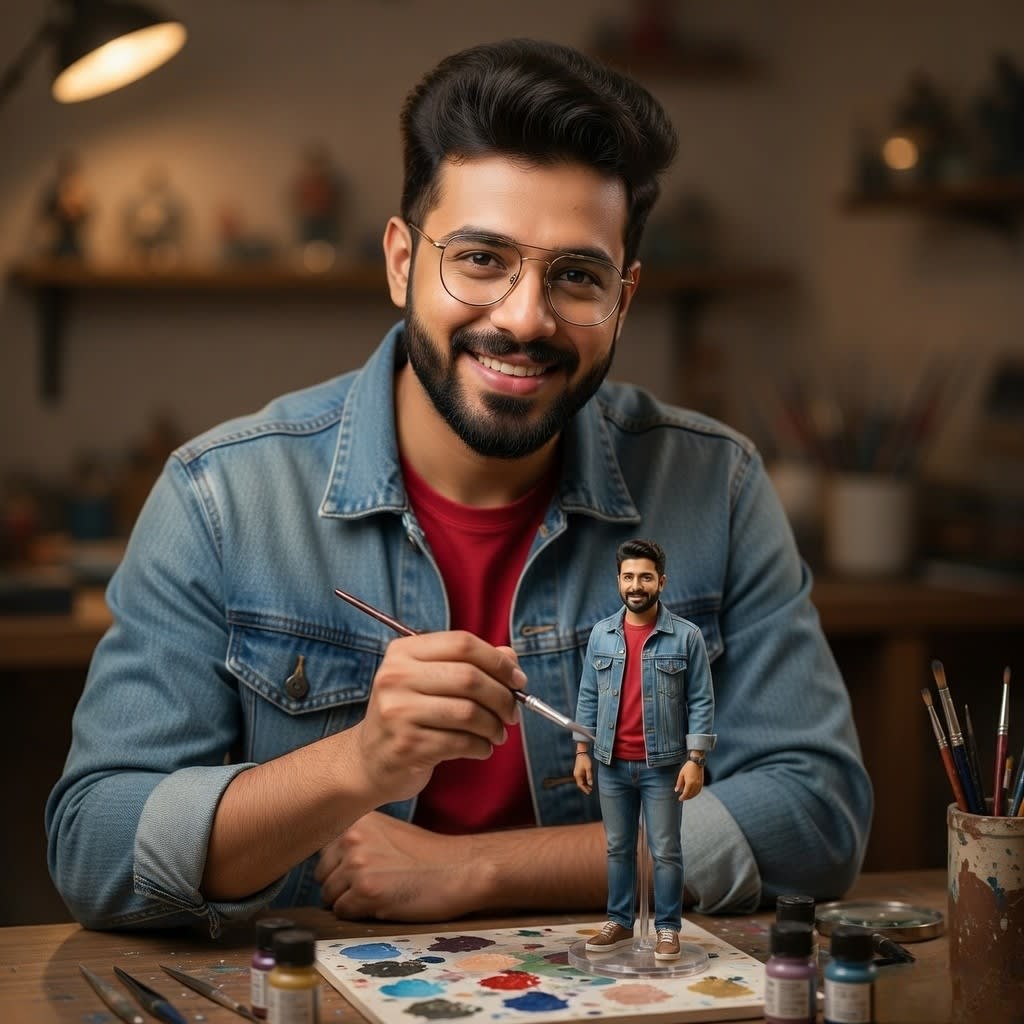 Hyper Realistic Self Miniature Artist Painting Own Figurine in Studio — men AI design template. Customize and generate on Aiartform.